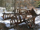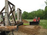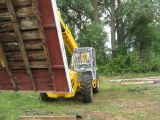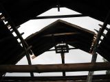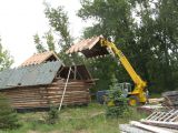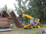Mary lifting a section of the old barn roof.