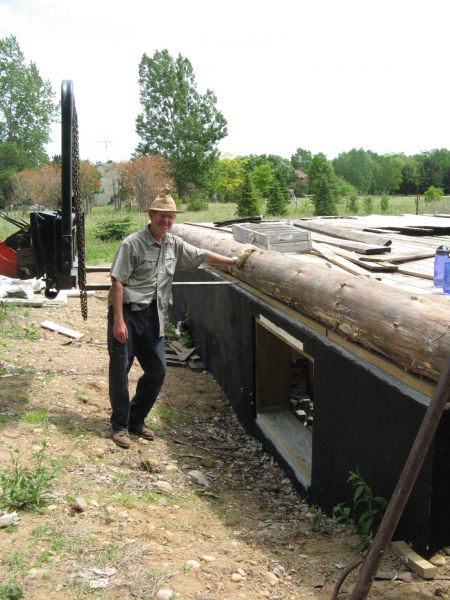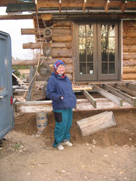 Chuck backfilling the foundation. The door frames to the deck are ready for logs to be built around them.