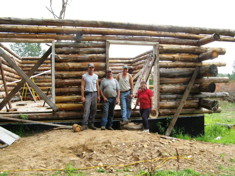 The doorways with logs. The crew(l-r): Arnie, Marvin, Leroy, and Mary.