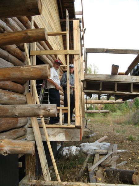 Mary and Jean adding nails for chinking.
