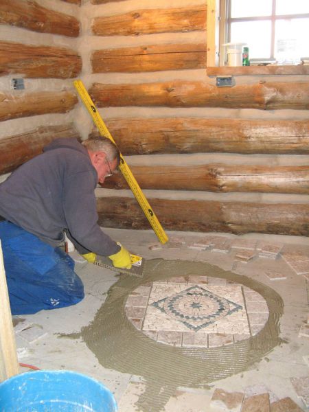 Starting the tile pattern in the main level bathroom.